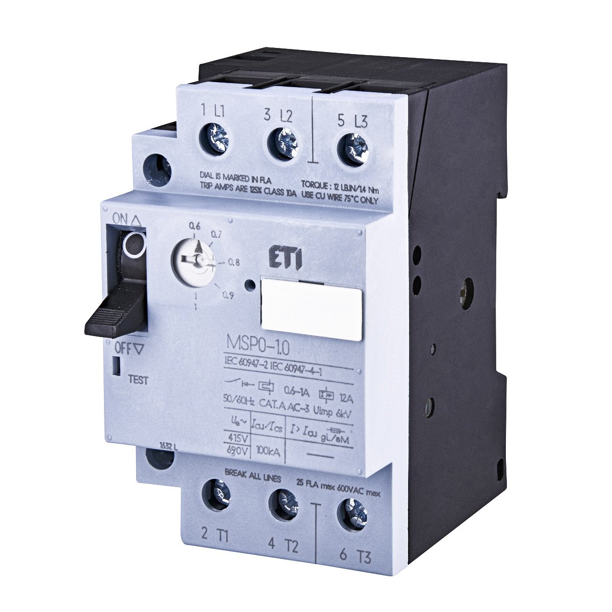 Автоматичний вимикач захисту електродвигуна ETI MSP0-1,0 (код для замовлення 4646619) призначений для пуску електродвигунів до 0,25kW та захисту його від струмів коротких замикань та перевантажень.