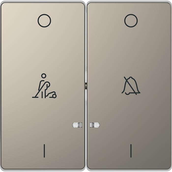 Подвійна клавіша з піктограмами «перекреслений дзвінок» і «покоївка». Використовується для вимикачів: 2-клавішних механізмів вимикача і 2-клавішного кнопкового вимикача.– Механізми для клавіші потрібно придбати окремо.
