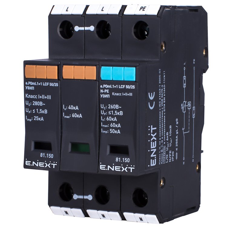 Пристрій захисту від імпульсних перенапруг (ПЗІП) E.Next e.POmI.1+1 LCF 50/25 призначений для захисту електричних систем від перенапруг. Він відноситься до категорії розрядників і використовується для запобігання пошкодженням обладнання.