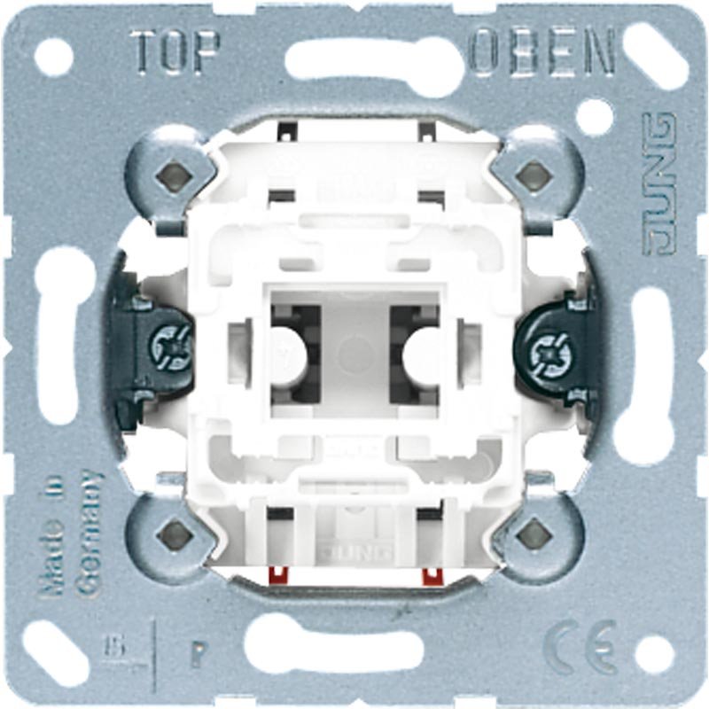 Механізм кнопкового 2-клавішного балансирного вимикача для одинарних клавіш виробництва Jung.– Тип: кнопка двополюсна з 2НВ контактами, без фіксації.