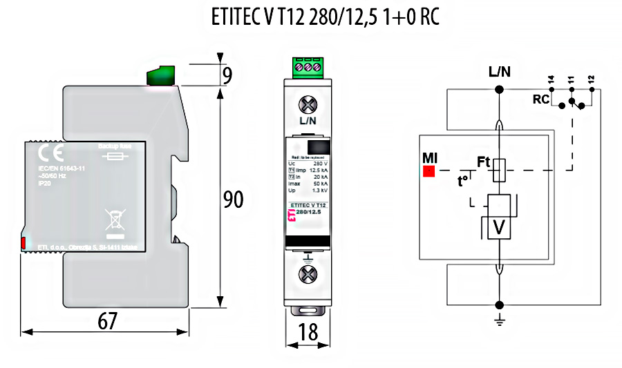 Обмежувач перенапруги ETITEC V T12 280/12,5 (1+0) (2442900) призначен для встановлення всередині об’єктів (будівель). Відповідно до VDE стандарту захисту від перенапруги визначаються як клас В, С. Відповідно до стандарту ІЕС визначаються як категорія І, ІІ та відповідно до EN - тип 1, тип 2. Встановлюються в головних розподільних щитах для захисту мереж від перенапруги, прямого та непрямого удару блискавки, наведеної та індукованої перенапруги. У випадку виходу з ладу обмежувача перенапруги спрацьовує тепловий захист та візуальний індикатор, який сигналізує про необхідність заміни пристрою.