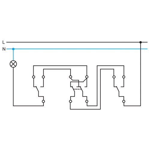 – Перемикач проміжний застосовується у прохідних схемах для включення/вимкнення одного джерела освітлення з двох і більше місць.– У схемі розташований між двома прохідними перемикачами. Альтернативні назви: «хрест», хрестовий вимикач, проміжний перемикач.