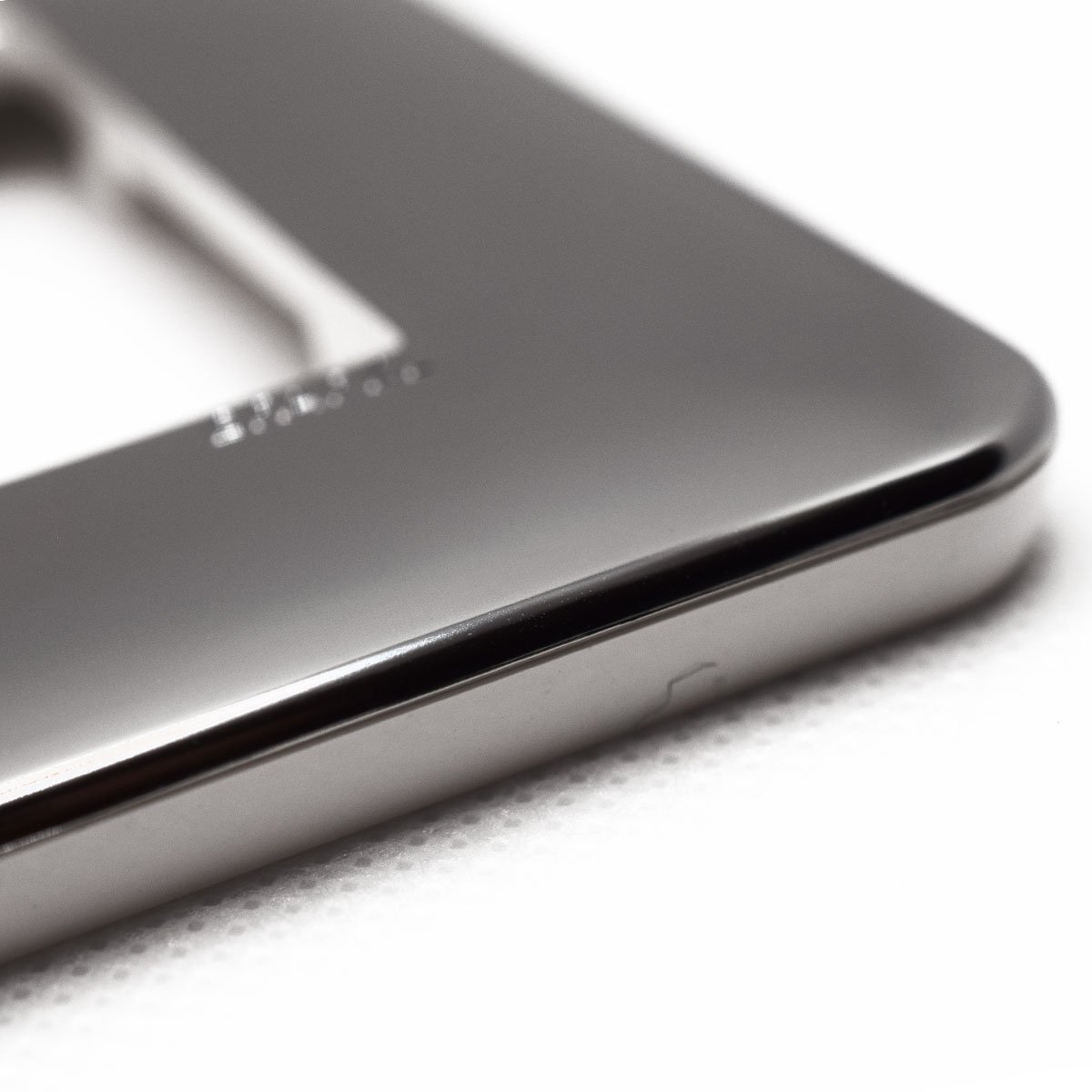 Рамка у хромовому кольорі з колекції «Latina» виконана із пластику з імітацією металу і може встановлюватись у горизонтальному та вертикальному положенні.