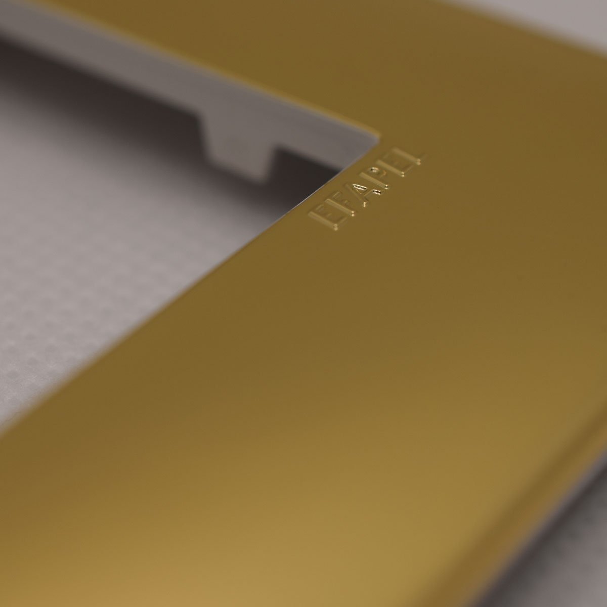 Рамка в кольорі золото з колекції «Latina» виконана із пластику з імітацією металу і може встановлюватись у горизонтальному та вертикальному положенні.