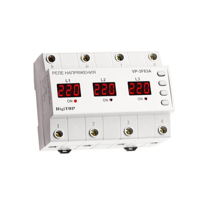Реле напруги DigiTOP VP-3F63A призначене для захисту промислового та побутового однофазного та трифазного обладнання від підвищеної або зниженої напруги, пропадання напруги, асиметрії фаз, а також контролю порядку чергування фаз (функція, що вимикається).
