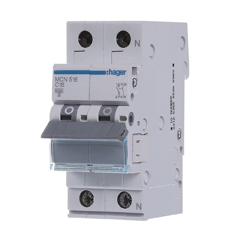 Автоматический выключатель Hager 1P+N, 16A, C, 6kA, 2 модульный, MCN516
