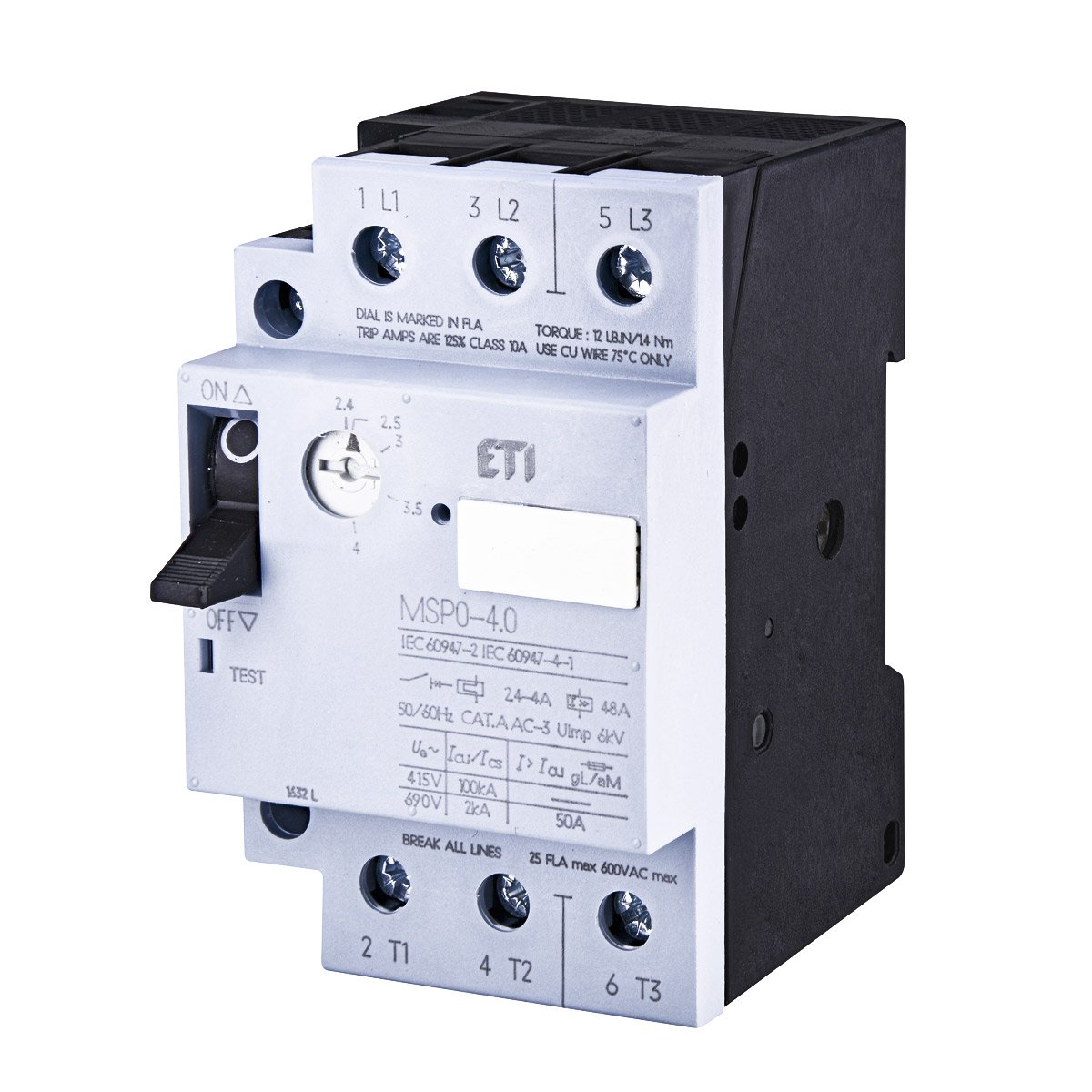 Автоматический выключатель защиты электродвигателя ETI MSP0-4,0 (код для заказа 4646622) предназначен для пуска электродвигателей до 1,5 kW и защиты его от токов коротких замыканий и перегрузок.