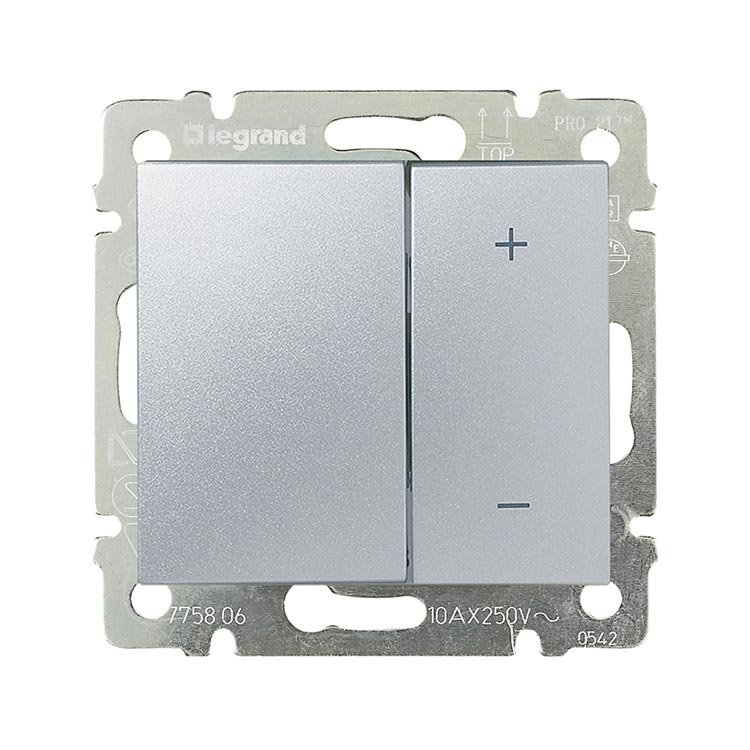 Светорегулятор — применяется для плавной регулировки освещенности, а так же для включения/выключения одной группы света. Управление нажимными клавишами, одна клавиша включить/выключить, другая- регулировка яркости.– Механизм и поворотная клавиша идут в комплекте.