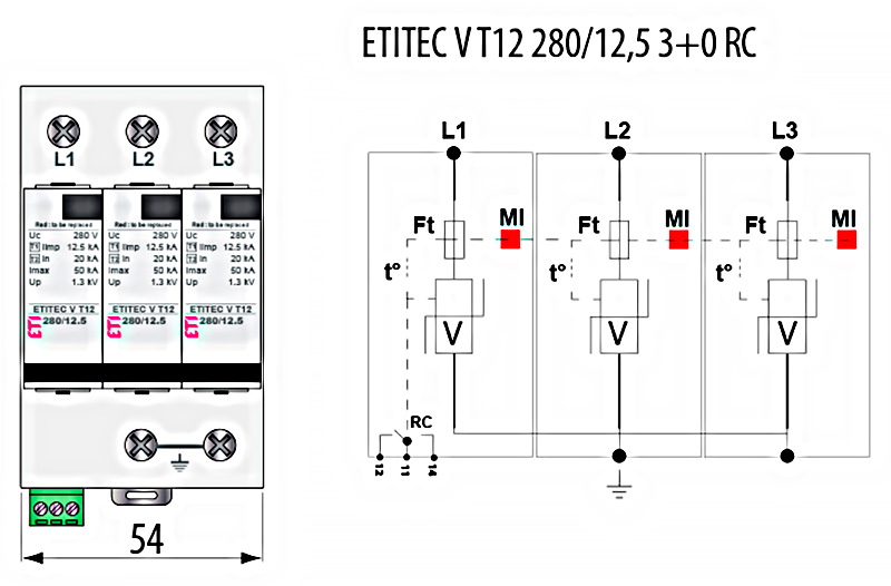 Ограничитель перенапряжения ETITEC V T12 280/12,5 (3+0) (2442915) предназначен для установки внутри объектов (зданий). В соответствии с VDE стандартом защиты от перенапряжения определяются как класс В, С. В соответствии со стандартом ИЭС определяются как категория I, II и в соответствии с EN – тип 1, тип 2. Устанавливаются в главных распределительных щитах для защиты сетей от перенапряжения, прямого и косвенного удара молнии, наведенного и индуцированного перенапряжения. В случае выхода из строя ограничителя перенапряжения срабатывает тепловая защита и визуальный индикатор, сигнализирующий о необходимости замены устройства.