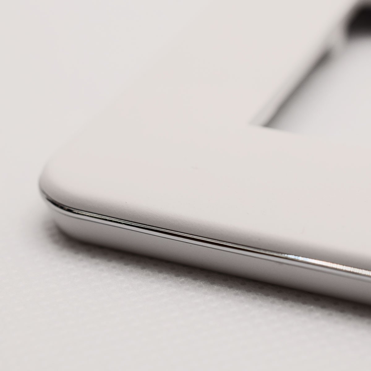 Рамка в цвете матовый белый / хром из коллекции «Latina» по всему контуру имеет хромовую металлическую окантовку, а сама рамка выполнена из высококачественного пластика имитирующего металлическую поверхность, тактильно приятную при касании к изделию. Может устанавливается в горизонтальном и вертикальном положении.