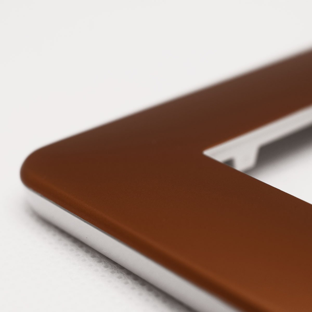 Рамка в медном цвете из коллекции «Latina» выполнена из пластика с имитацией металла и может устанавливается в горизонтальном и вертикальном положении.