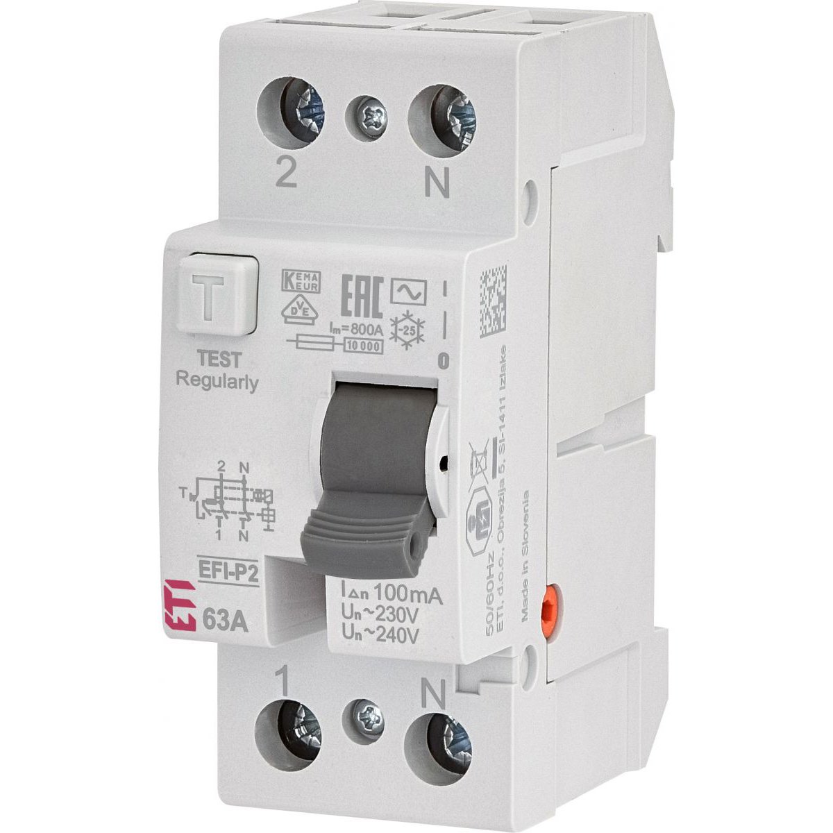 Дифференциальное реле (УЗО) 2р EFI-P2 63/0,1 тип AC (10kA), ETI 2061223
