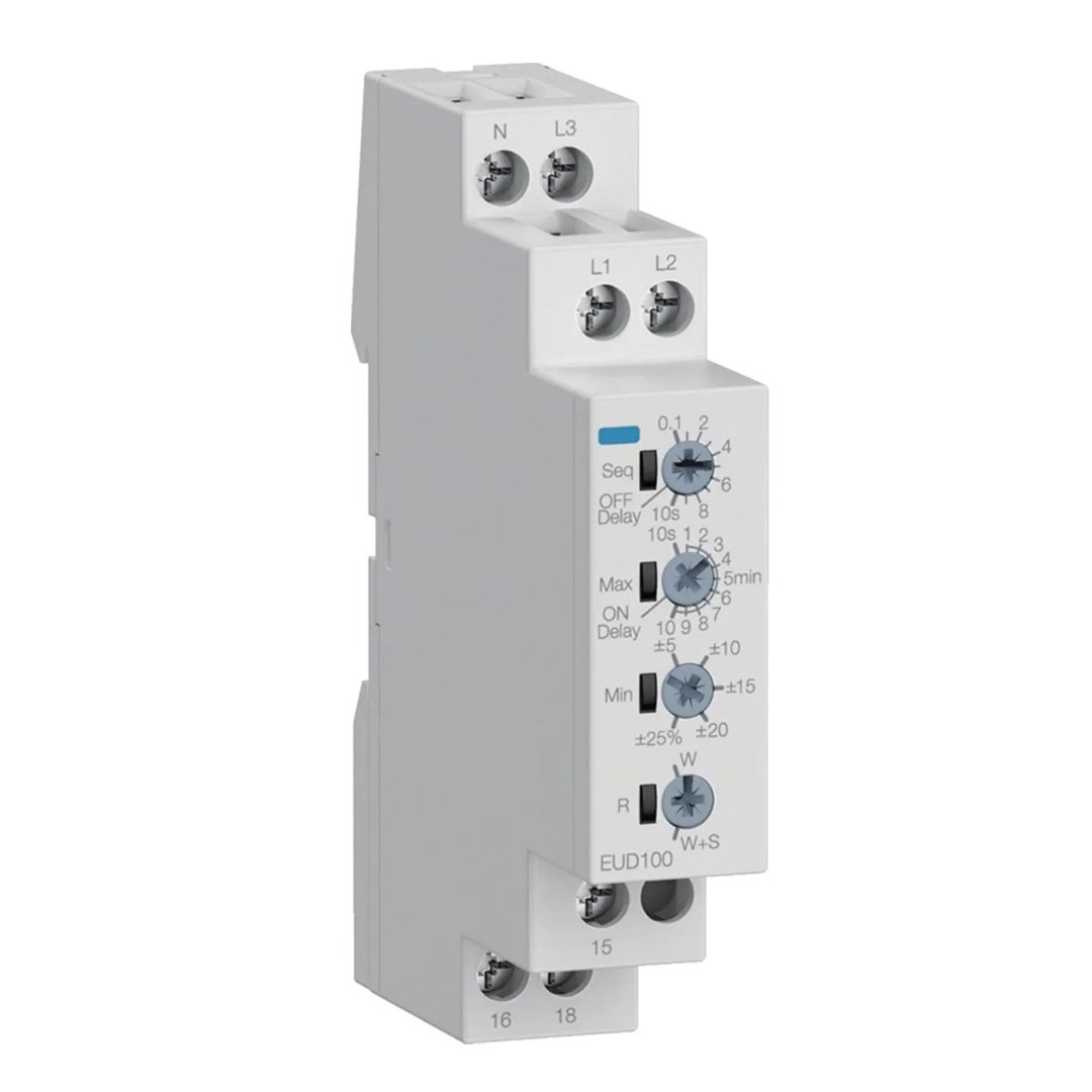 Контроль напряжения в 3-фазной и 1-фазной сети с регулируемым контролем диапазона, задержкой отключения, задержкой включения, а также контролем чередования фаз и обрыва фазы. Функции и пороговые значения устанавливаются с помощью 4 потенциометров. 4 световых индикатора информируют о состояние устройства и установки.
