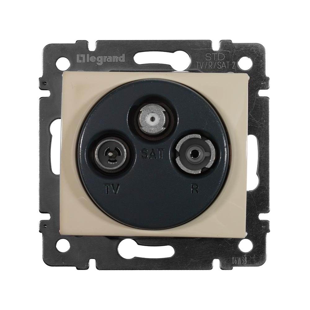 Телевизионная розетка 774337 — имеет три выхода (штекеры диаметром 9,5 mm), используется в паре с оконечными TV-FM-SAT-розетками для подключения по схеме — «шлейф».– Механизм и лицевая панель розетки идут в комплекте.