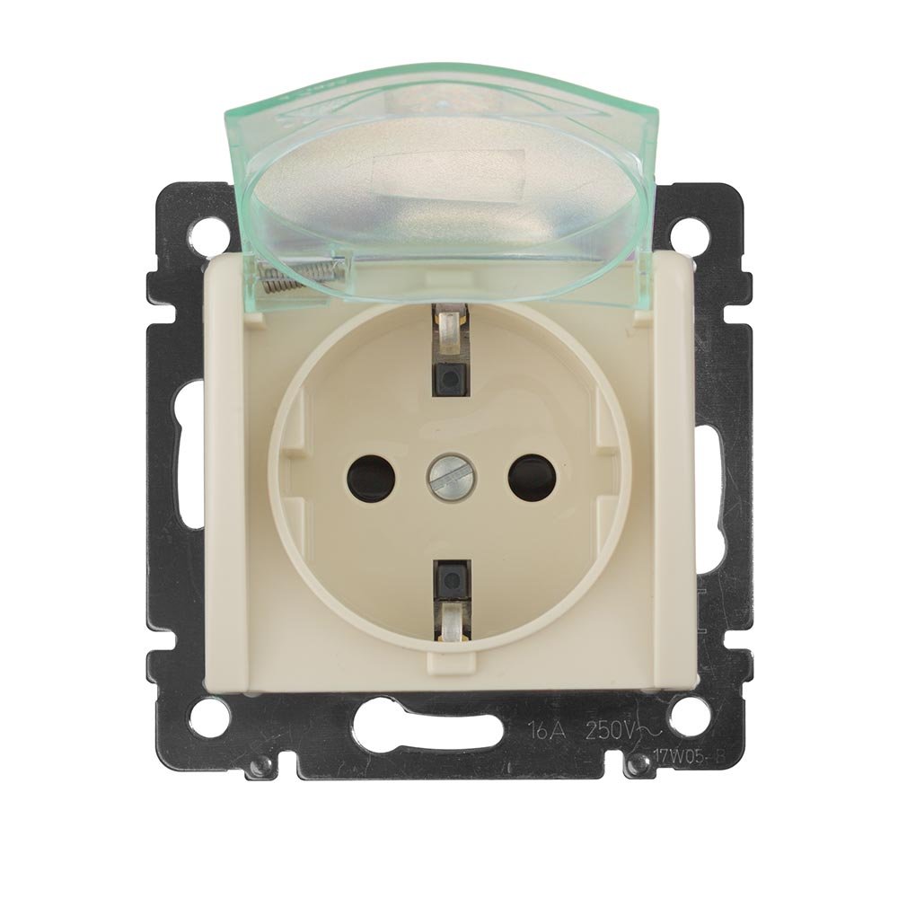 Розетка силовая с заземляющим контактом и крышкой внутренне установки.– Имеет высокую степень защиты — IP44 и может устанавливаться в местах с повышенной влажностью или запыленностью.
