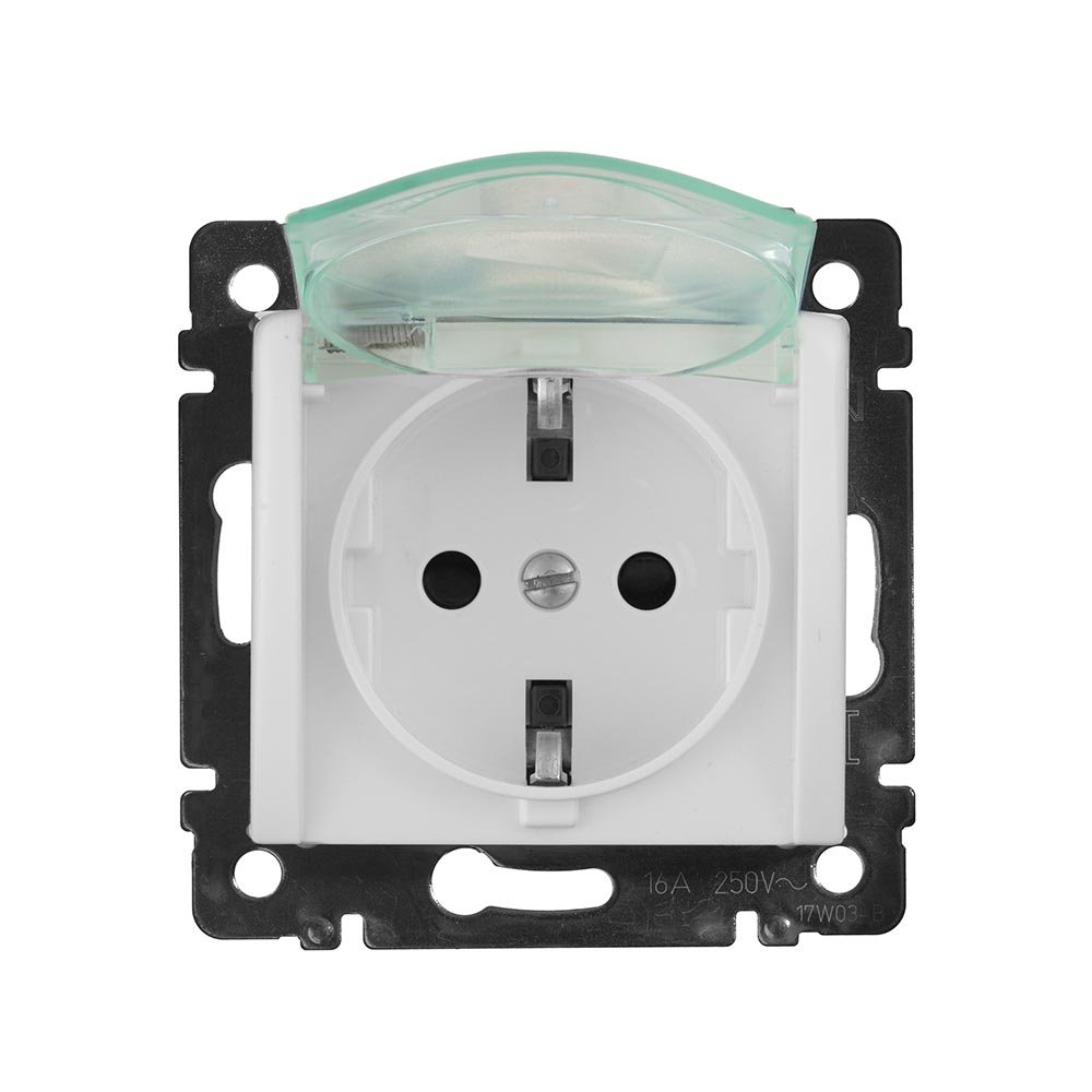 Розетка силовая с заземляющим контактом и крышкой внутренне установки.Имеет высокую степень защиты — IP44 и может устанавливаться в местах с повышенной влажностью или запыленностью.