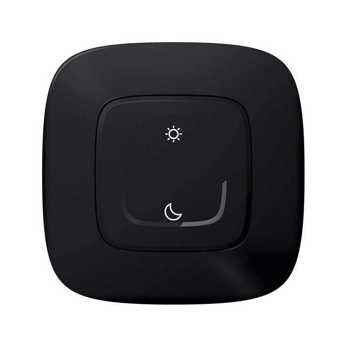 Умный беспроводной сценарный выключатель «День/Ночь» находится в спальне.Нажатие на верхнюю часть клавиши активирует сценарий «Ночь», который можно настроить в приложении «Home + Control».