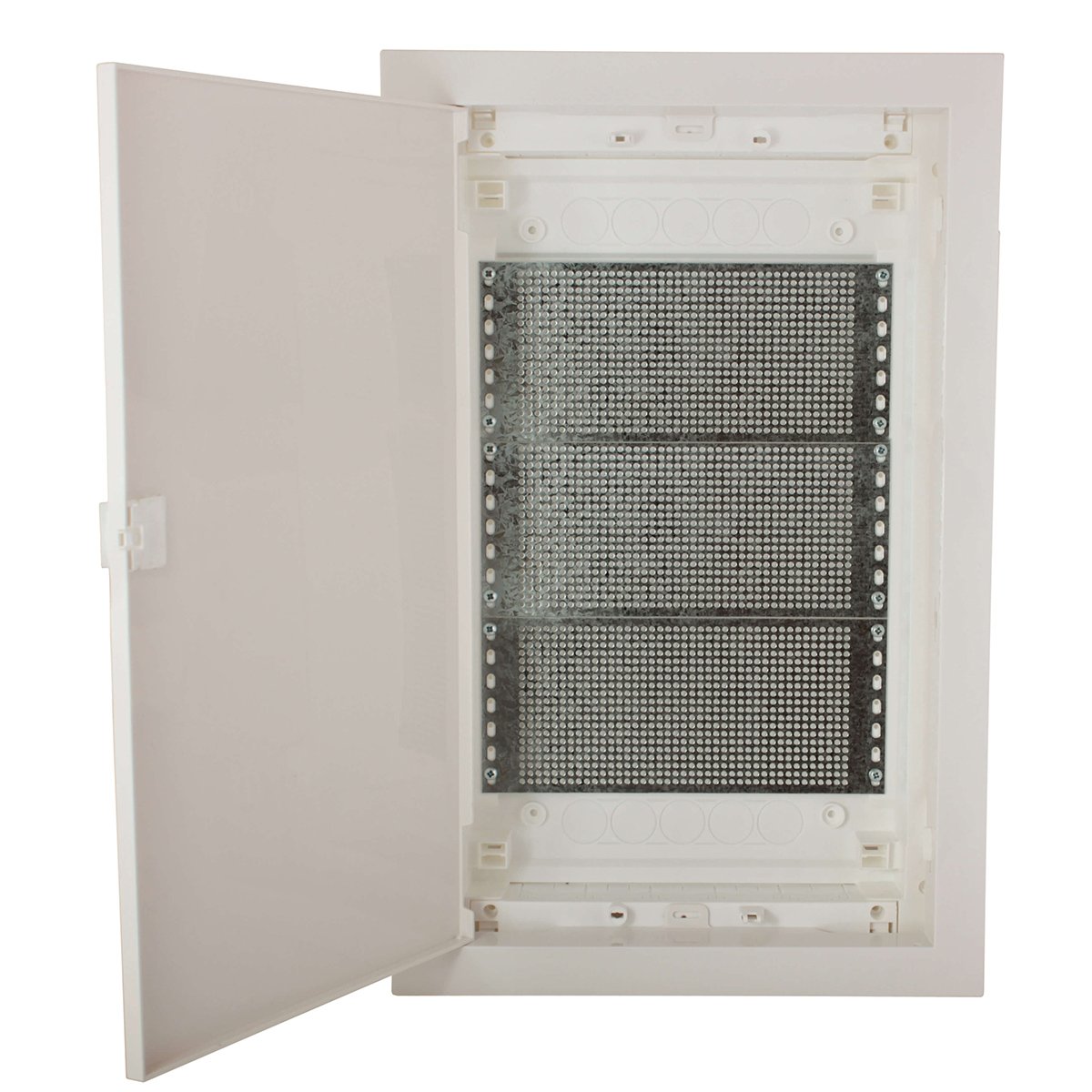 Щит ECG42 MEDIA-PO 1101191 комплектуется перфорированными монтажными панелями и кронштейнами для установки в гипсокартон. Щит поставляется с перфорированной белой пластиковой дверцей.