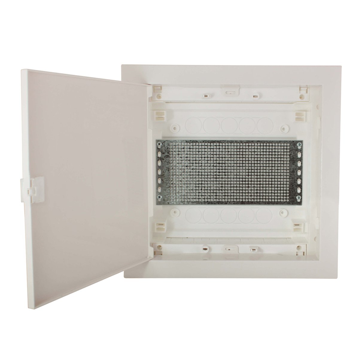 Щит ECG14 MEDIA-PO 1101189 комплектується перфорованими монтажними панелями та кронштейнами для установки в гіпсокартон. Щит постачається з перфорованими білими пластиковими дверцятами.