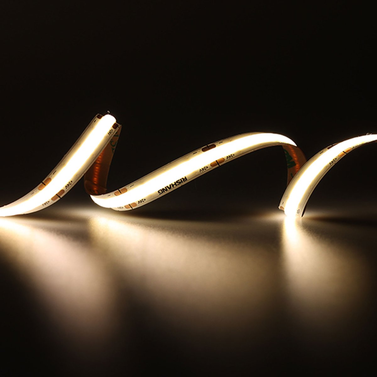 Світлодіодна стрічка Rishang 18861 COB-320-IP20-WW-8-24 RM0801EC-A з щільністю 320 світлодіодів на метр і теплою колірною температурою 2400K забезпечує м'яке та затишне освітлення, ідеальне для житлових і комерційних приміщень.